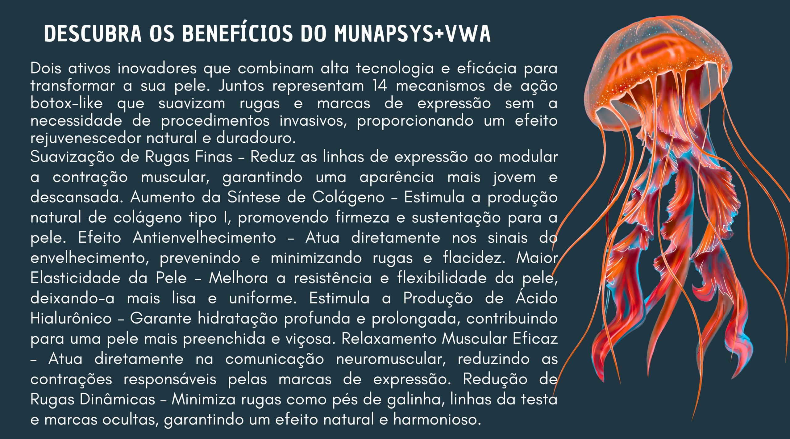 regula a formação e reciclagem das sinapses, o Munapsys foca na inibição da liberação de neurotransmissores, ampliando o efeito relaxante das rugas e promovendo um resultado mais visível e duradouro para linhas de expressão e sinais de envelhecimento.