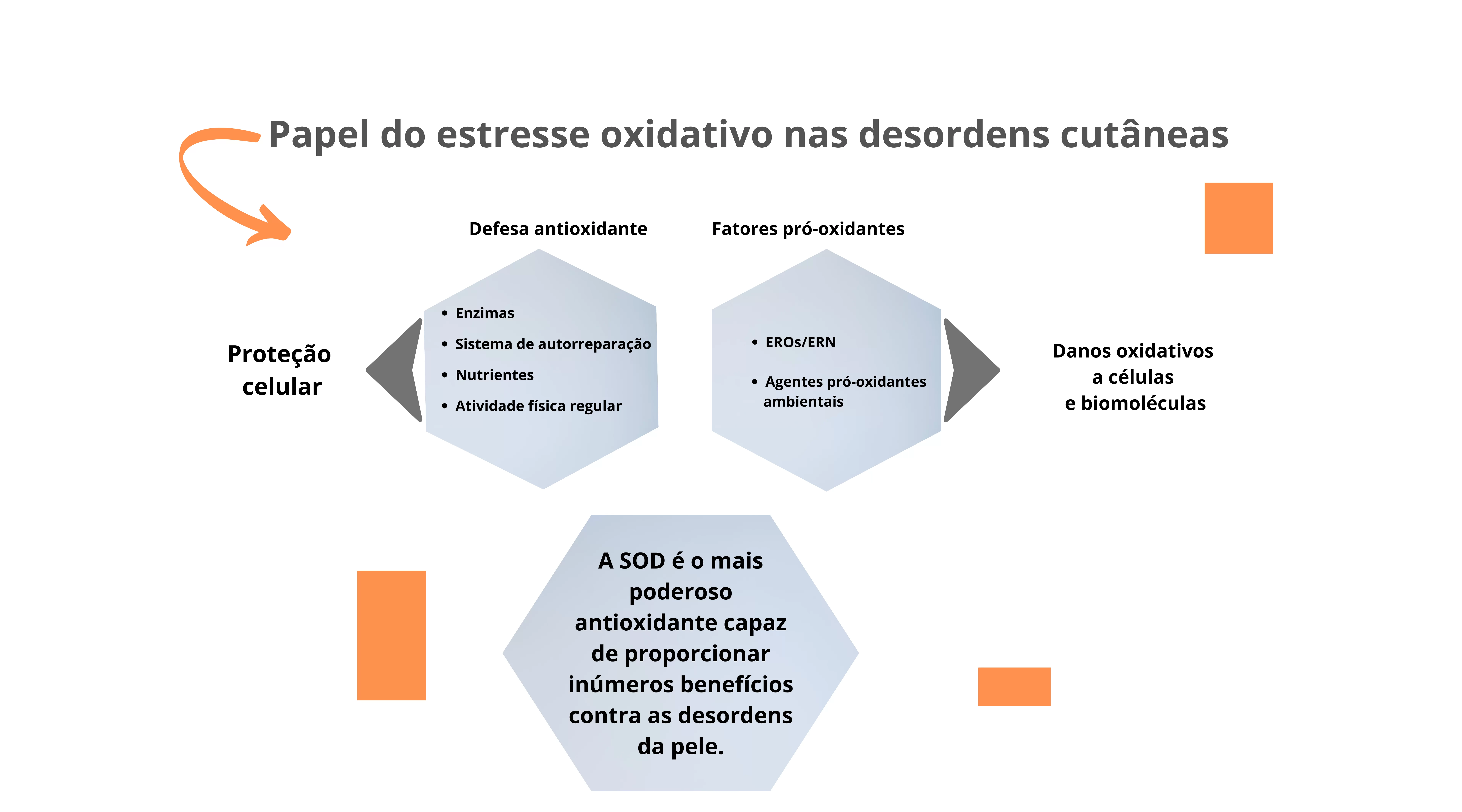 A SOD ainda é capaz de induzir a expressão das enzimas antioxidantes endógenas o que promove naturalmente a diminuição de estresse oxidativo e da inflamação envolvidas em diversas doenças cutâneas.